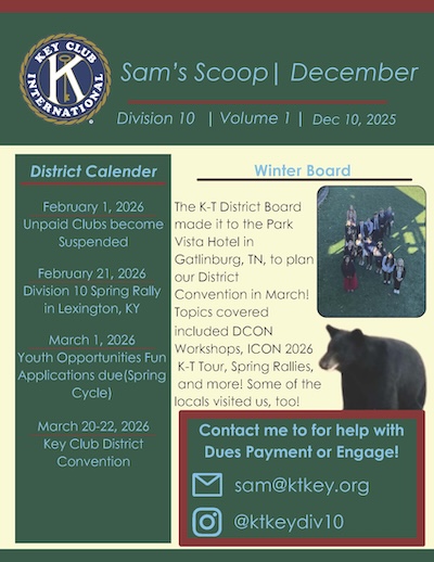 Please see the attached newsletter for an update on DCON and Winter Board– the most vital piece of information I can convey is that our Divisional Spring Rally will be on February 21st in Lexington, Kentucky. I’ll be writing to each club individually and will pass along more information when a location is decided. The important thing to know is that all club members are invited, and that we will choose a Most Outstanding Key Clubber at this rally, elect a new Lieutenant Governor, and forge interclub relationships. Invite your clubs to this event!