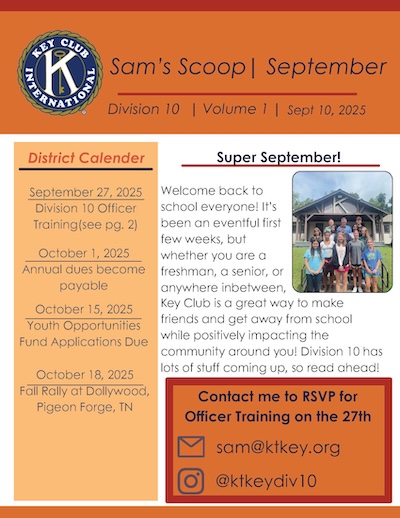 Division 10 | September 2025 Newsletter (382 downloads )Hi Division 10! Officer Training is on the 27th, so please email me at sam@ktkey.org if you will be able to attend!