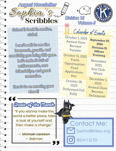 School is officially back in session. This issue includes a short message, a Calendar of Events, a Quote of the Month, information on Fall Rally and the Div 15 Officer Training, promotion of Key Club Week and Trick or Treat for UNICEF, and Rally, and information about the Youth Opportunities Funds.