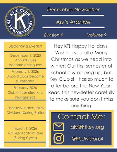 Division 4 | December 2025 Newsletter (106 downloads )Hey KT! Happy Holidays! Please read my December Newsletter to learn more about upcoming events in the district!