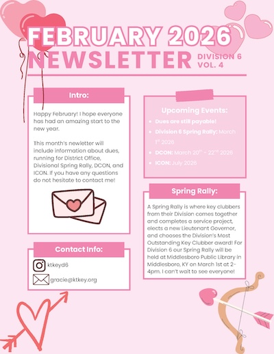 Hey Division 6! Here is the February Newsletter. This issue will include information about Spring Rally, running for District Office, DCON, and ICON. As always, if you have any questions or concerns do not hesitate to contact me!