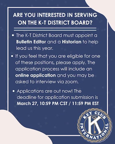 As you may know, at DCON we elected and installed the 2025-2026 K-T District Board. However, our board is not yet complete. We are in need of a District Historian and District Bulletin Editor to serve on our district board. This is a great opportunity for any Key Clubber who wants to meet new people, improve their leadership skills, and overall serve their home, school, and community. To apply, you must complete an online application and you may be asked to attend a Zoom interview.